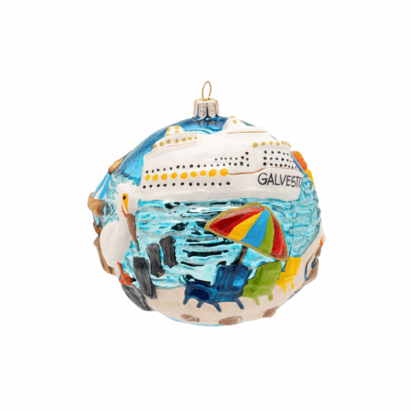 Bring a piece of the Gulf Coast home with this Galveston Island glass ornament, exclusively from Houston Ornaments. Featuring the Historic Pleasure Pier, sandy beaches, colorful umbrellas, playful crabs, and a cruise ship, this collectible captures the fun and beauty of Texas’ favorite island getaway.